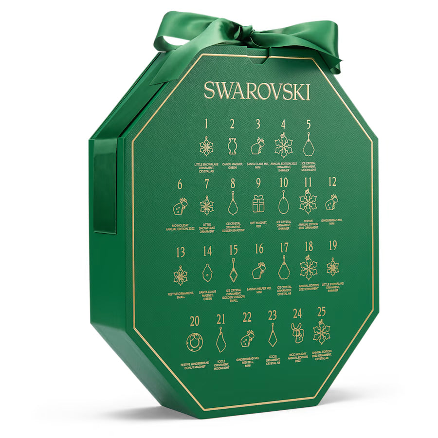 Count down the days leading up to the holidays and celebrate the magic of the season with this sumptuous Swarovski Advent Calendar. Available only for 2022, it is filled with 25 expertly cut crystal creations, including some designs exclusive to the calendar and featuring much-loved Swarovski characters Mo the cow and Ricci the moose. The ornaments, figurines, and magnets can be used to adorn a festive table or tree, or can be presented on our elegant Ornament Stand or the Bell Jar Display. Decoration object. Not a toy. Not suitable for children under 15.