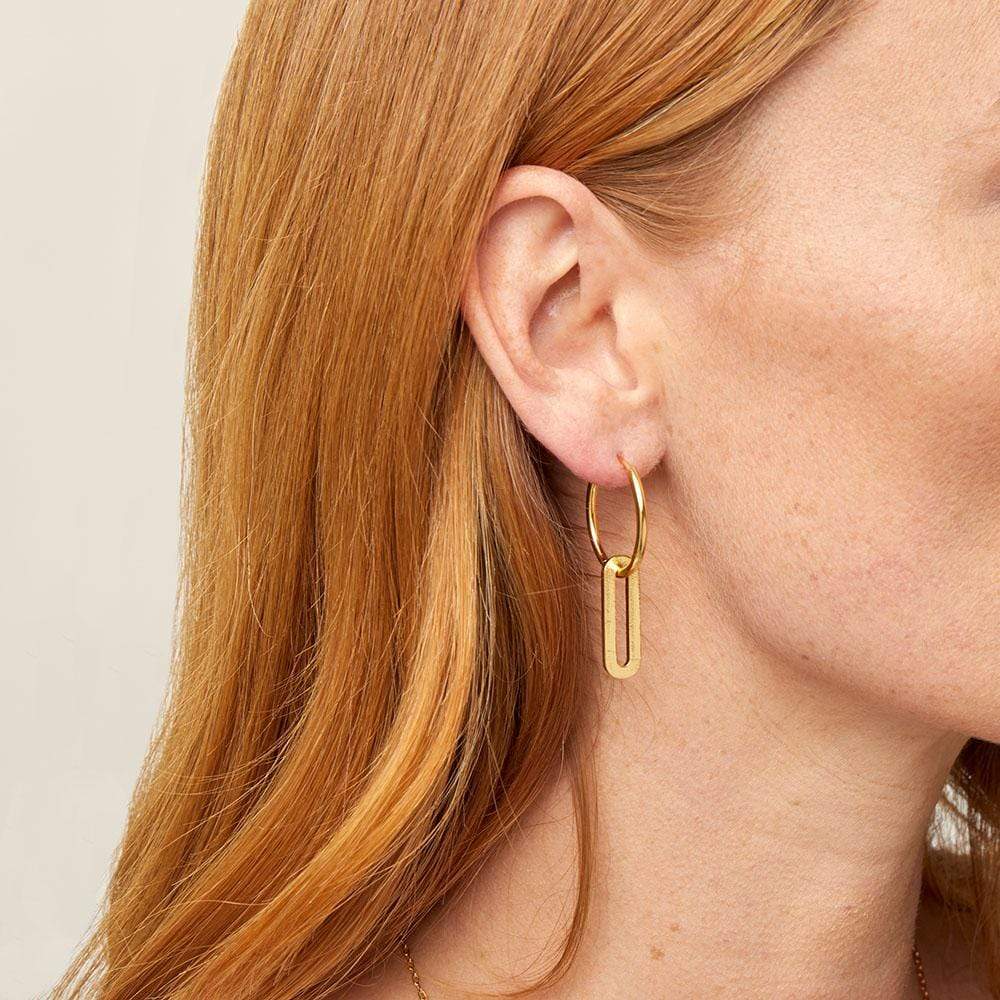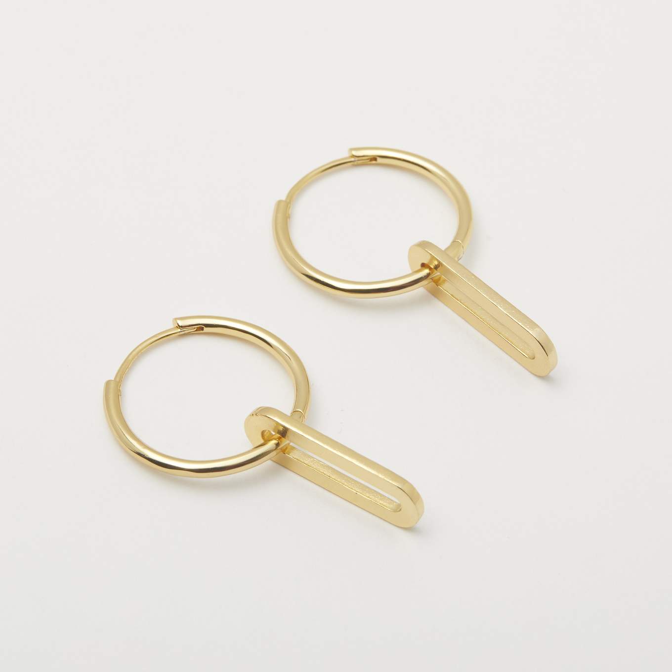 Shiny, tubular hoops are met with a high-shine rectangle link charm.
