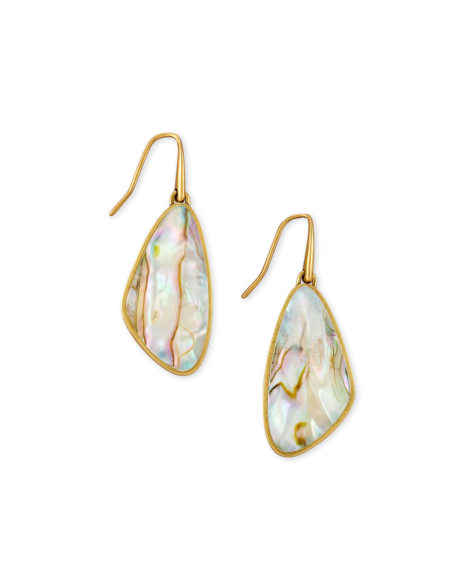 At once modern and eclectic, a custom shape inspired by a pebble found on the beach defines the lightweight Mckenna Vintage Gold Small Drop Earrings in White Abalone.