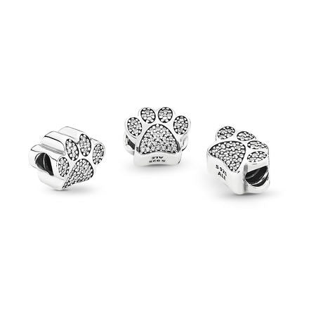 Celebrate your favorite four-legged friend with this Pandora paw print charm. Finely crafted in sterling silver, this adorable charm is embellished with sparkling cubic zirconia stones. A delightful gift for any cat or dog lover, it will add whimsical charm to your Pandora jewelery collection.