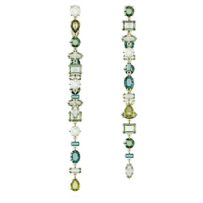 Inspired by nature, energizing emerald hues give these drop earrings a rich vibrancy. Each earring has two asymmetrical strands crafted with a mix of stone cuts, featuring a multitude of green tones complemented by a gold-tone plated setting. A beautifully bohemiam piece to gift to a loved one - or yourself.