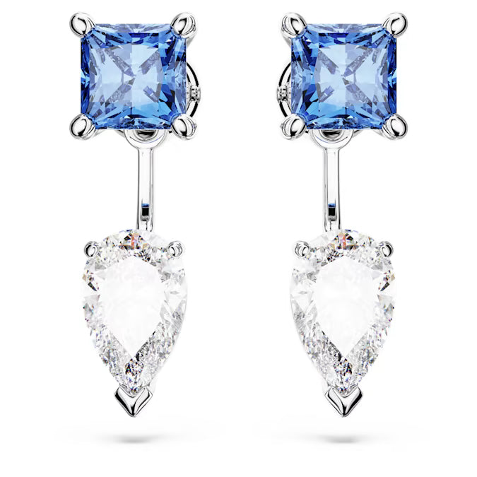 These attractive Mesmera earrings are a versatile and spellbinding choice. The pierced design is rhodium plated and features a pair of prong-set Swarovski Zirconia in pear and square cuts. Wear them as single blue studs or adjust the height of the detachable pear-cut drop to suit your style. A perfect gift to inject any evening outfit with elegance and color.