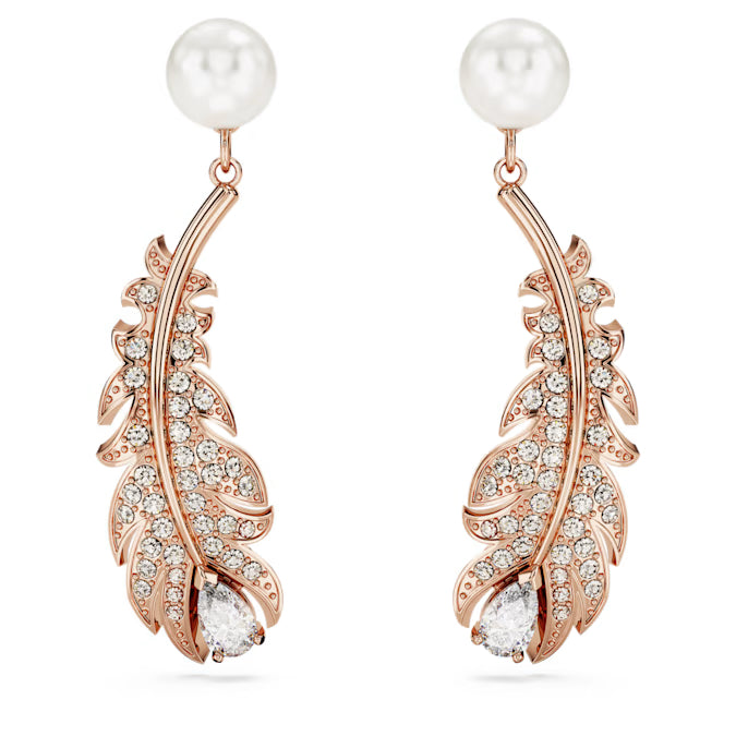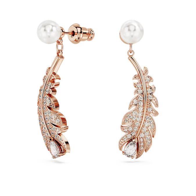 The gorgeous colors and natural shapes of these feather-inspired pierced earrings will add light elegance to your style. Each rose gold-tone plated piece features a single Swarovski Crystal Pearl with a beautiful feather motif that hangs beneath in shimmering pink pavé and Swarovski Zirconia. A nature-inspired gift for yourself or a loved one.
