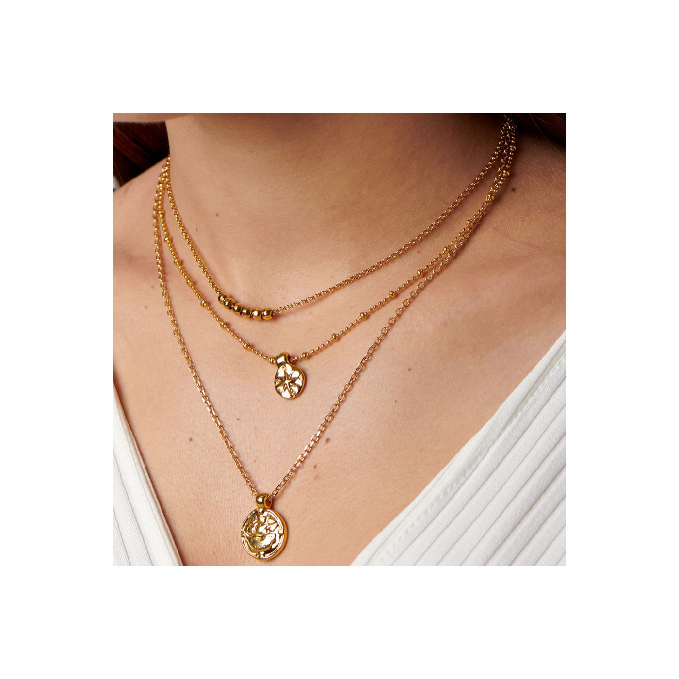 Midi triple gold- plated necklace, composed of several gold balls and casual style. It includes a compass, one of the main protagonist of Navy Collection, and one central medallion with a recorded ship. A jewel that give a chic style to all your outfits and that you can wear anytime. A design made in Spain by UNOde50 and 100% made by hand.