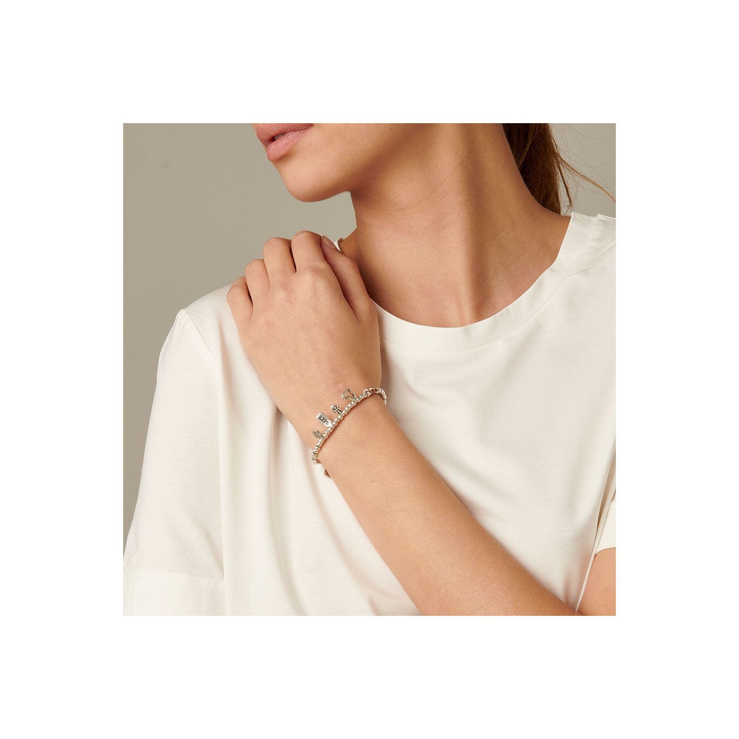 Original silver-plated bracelet, consisting of multiple pearly pieces with three charms: UNOde50 padlock, an oval medallion topped with SWAROVSKI® ELEMENTS blue crystal and a clover, the universal symbol of good luck. This jewel is 100% handmade way, in Spain, by UNOde50.