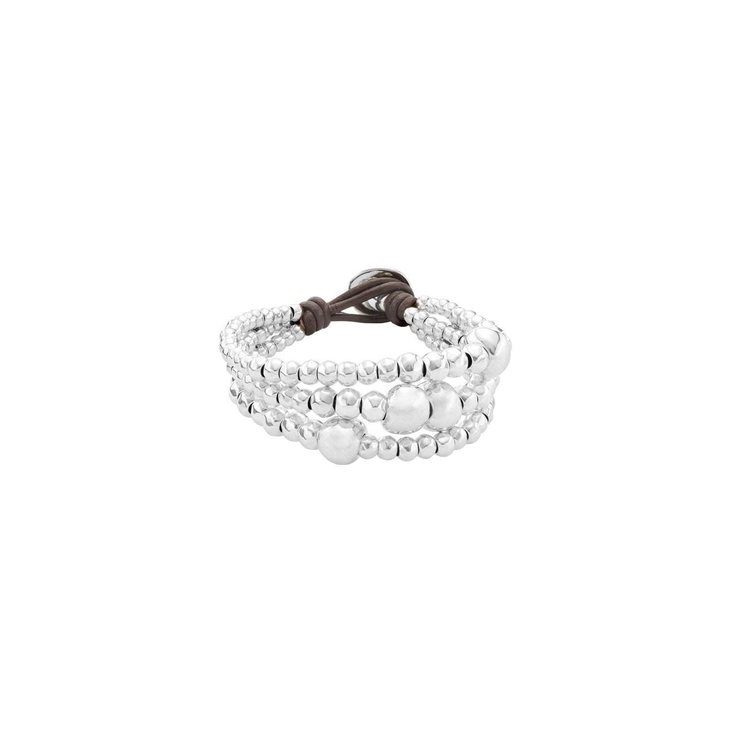 Original bracelet that combines three silver-plated straps and beret-style clasp in brown leather, which you can wear on the most special occasions. Consists of a several small pearl-shaped stones combined with four larger pearl shapes. This fine piece is made 100% by hand in Spain by UNOde50.